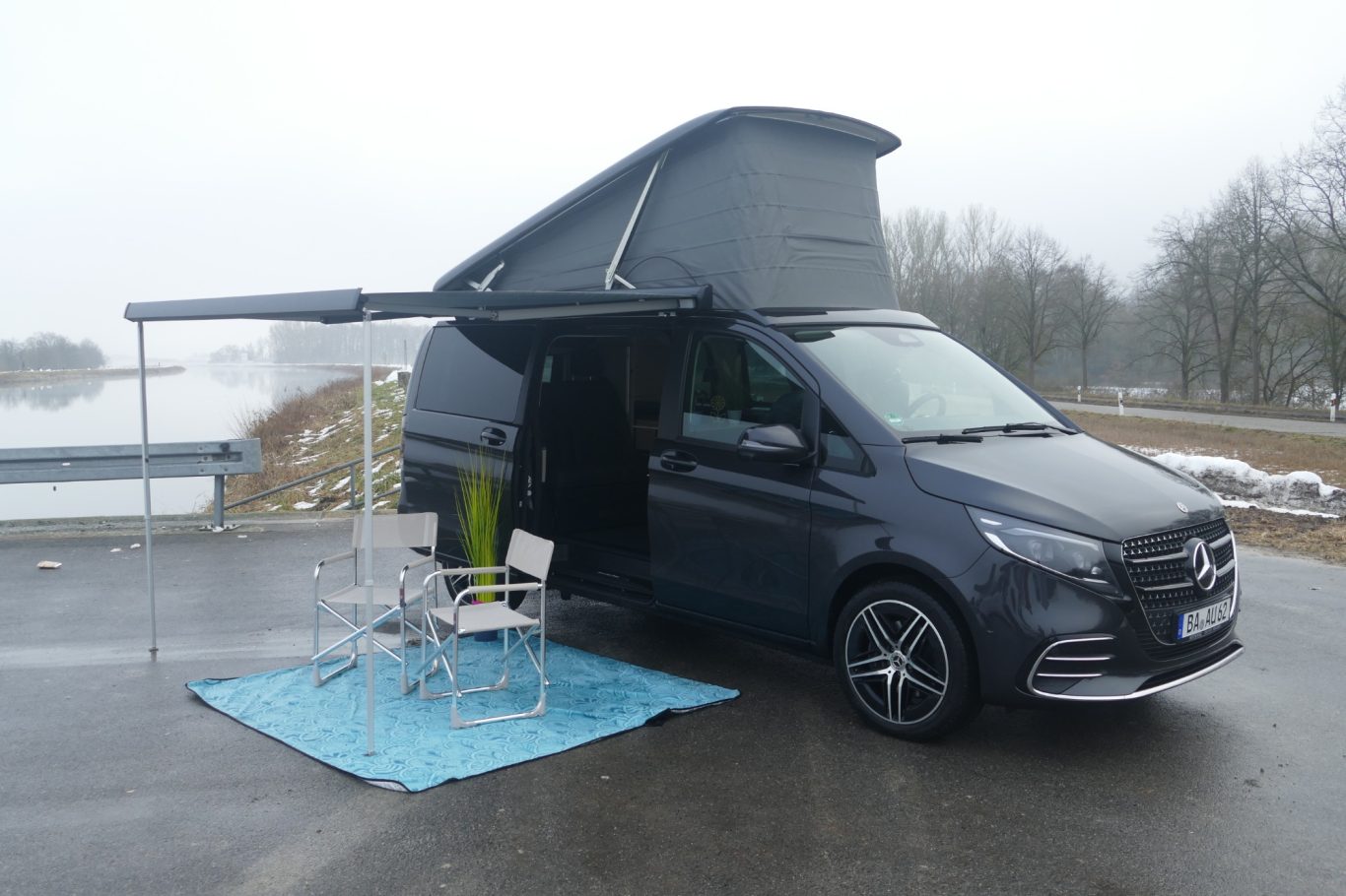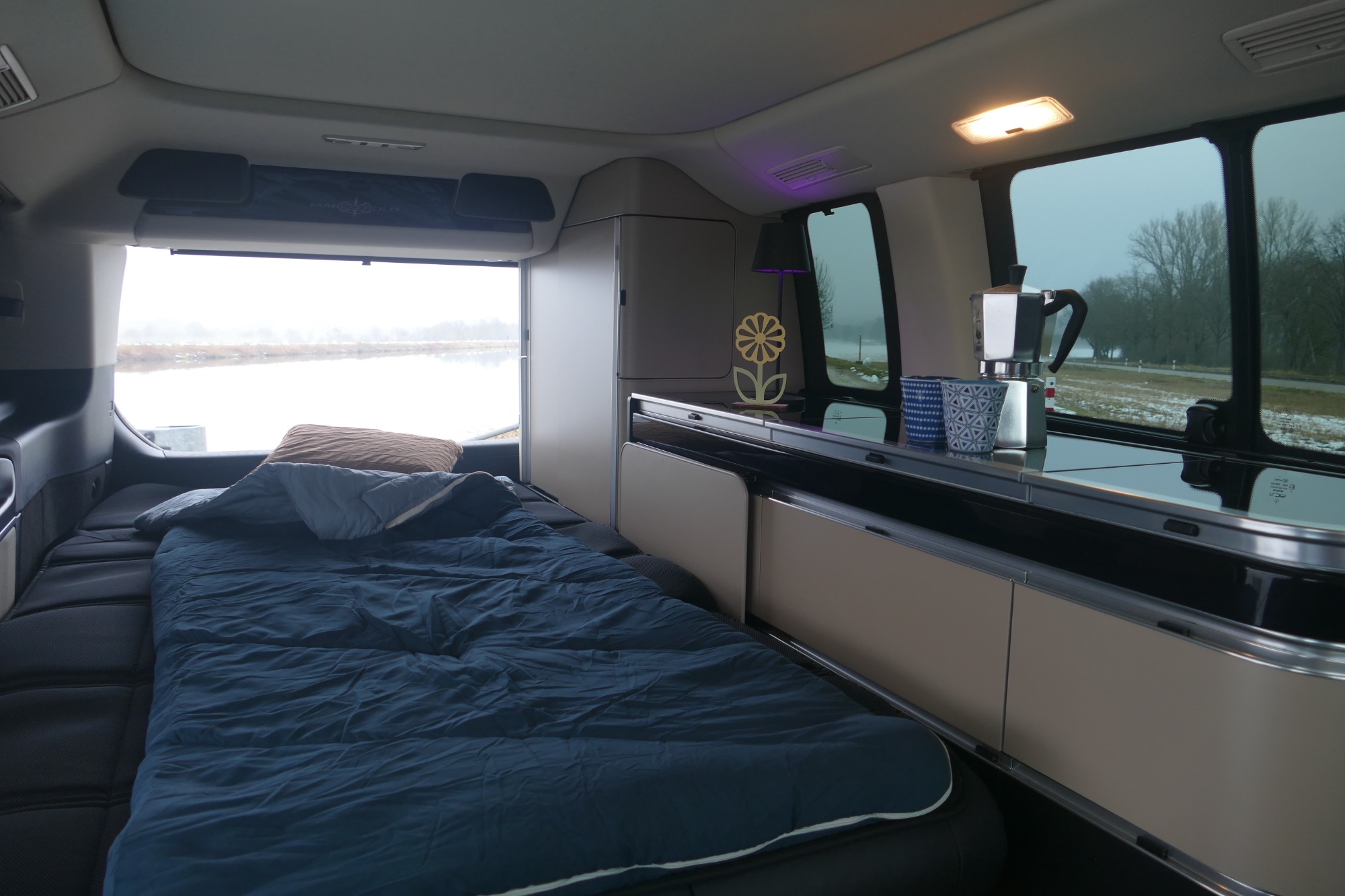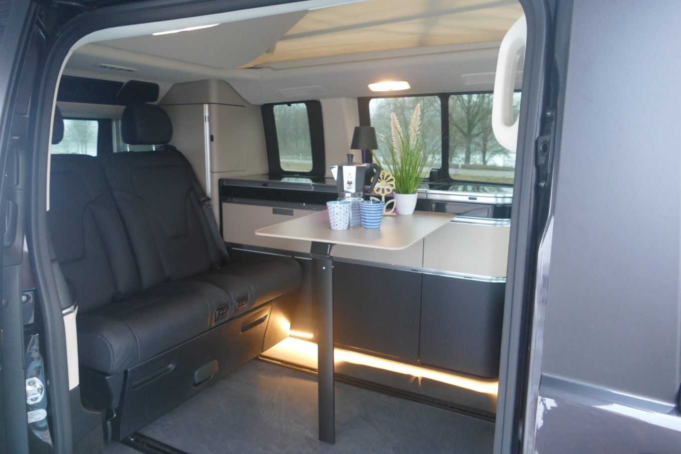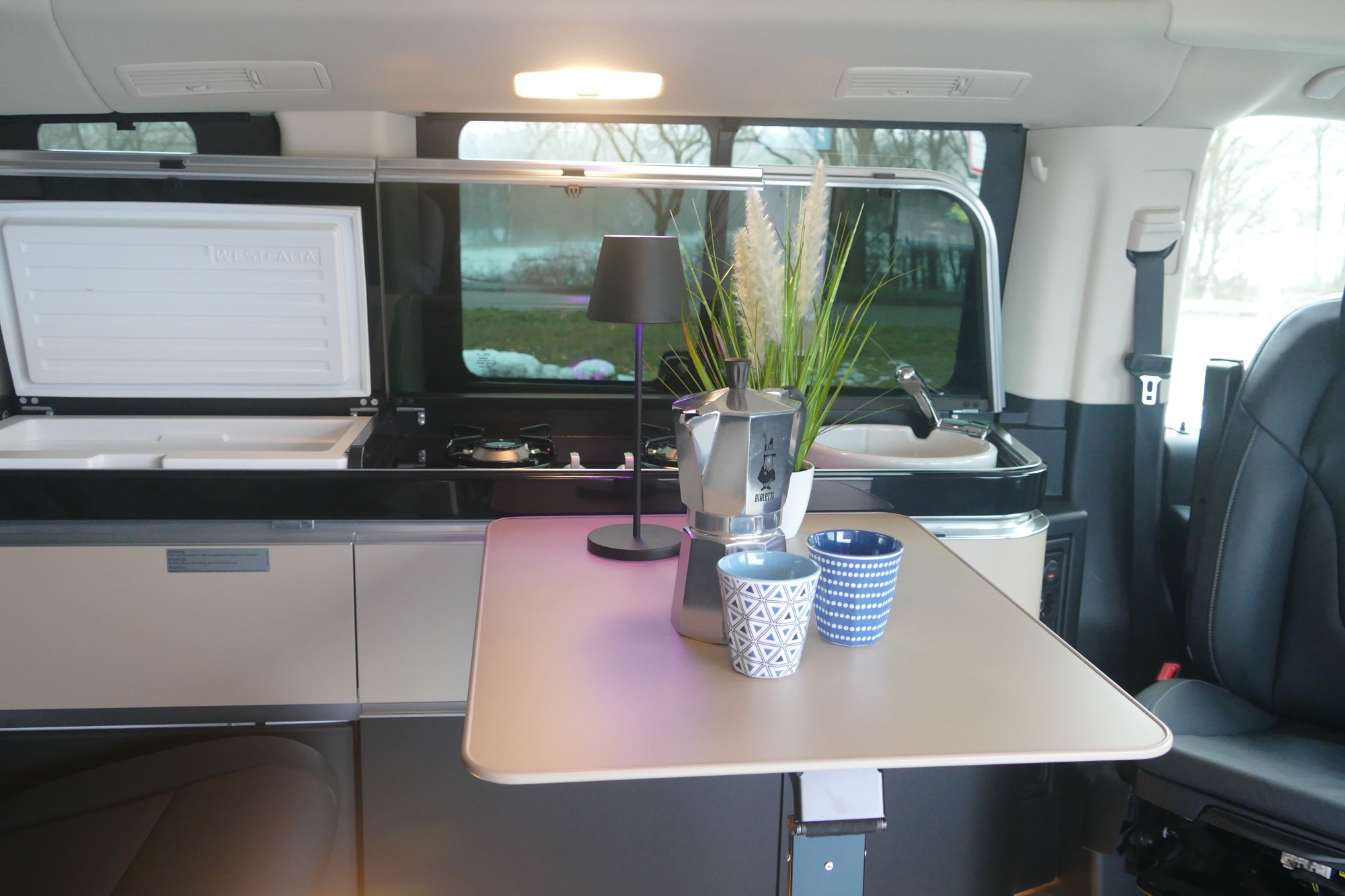 Innenausstattung in Klavierlack-Optik, 42-Liter-Kühlbox, zweiflammiger Gasherd, Edelstahlspüle, Stauraum, Besteckschublade, Wassertank