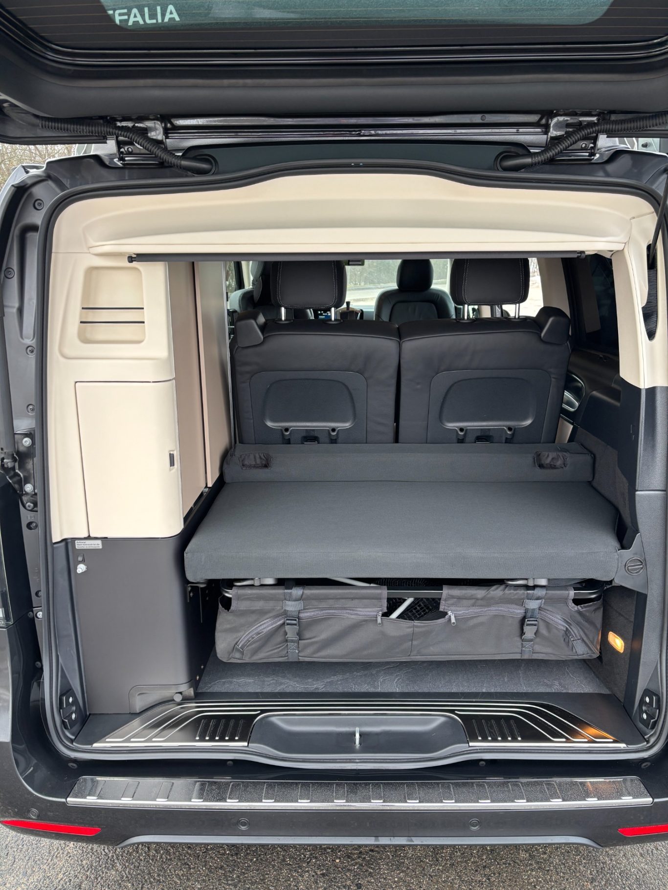 Unten auf der elektrisch umlegbaren Rücksitzbank (Liegefläche Topper L 2,03 m x B 1,13 m)