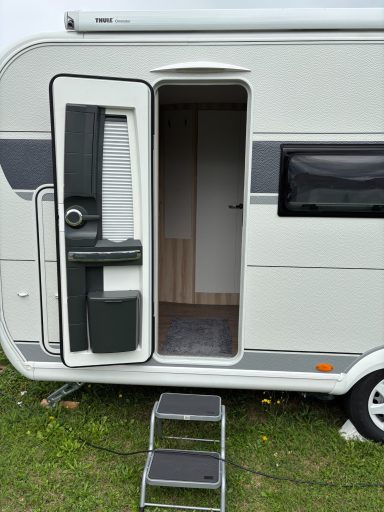 Extrabreite Eingangstür, einteilig, mit Dreifachverriegelung, Fenster, Abfalleimer, Staufächern und Insektenschutzplissee im Türrahmen