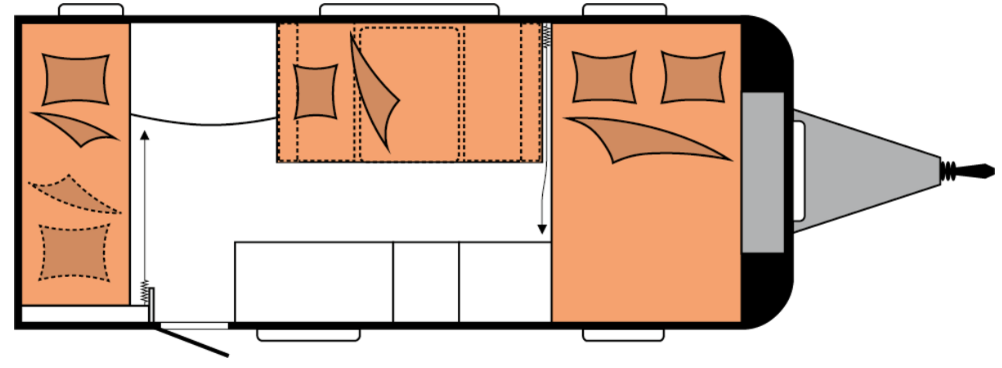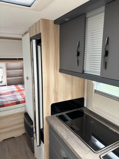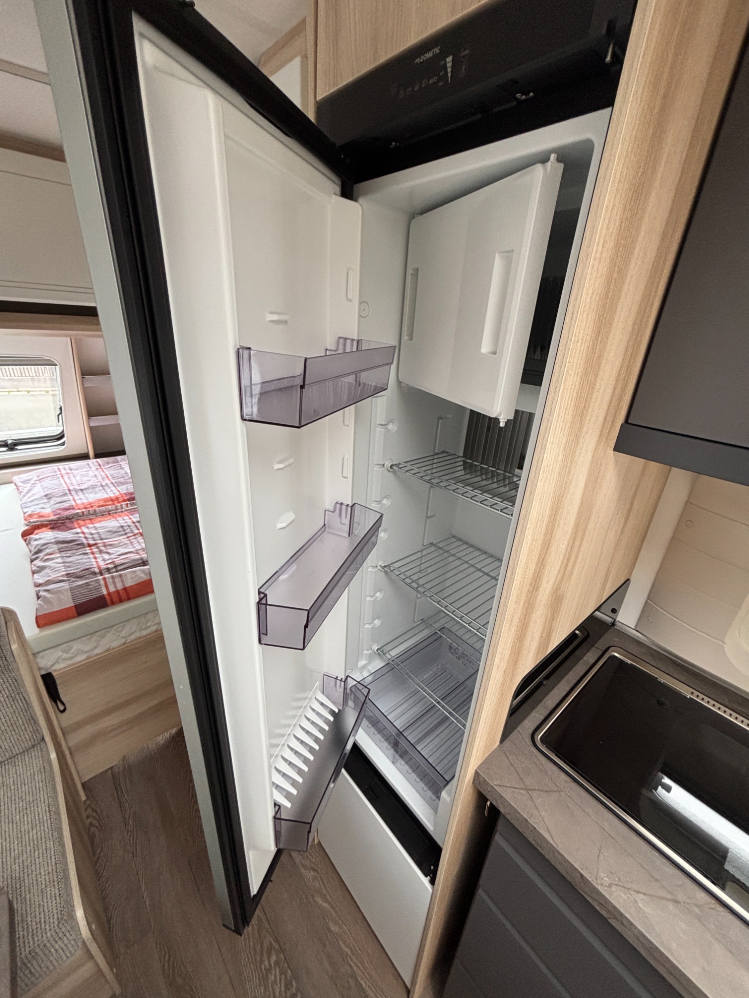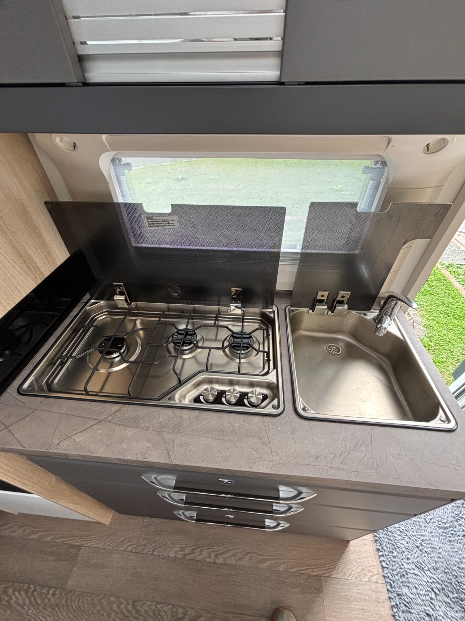 Extra großer Kühlschrank DOMETIC mit Doppelanschlag (133-Liter Volumen, inkl. 12-Liter-Frosterfach), Spüle aus Edelstahl, 3-Flammkocher (Gas). Frischwassertrank 25 Liter (von außen befüllbar), 1x 230 V Steckdose, Schubladen mit Vollauszug, Soft-Close und Push-Lock-Verschlüssen, Besteckeinsatz, Handtuchhalter